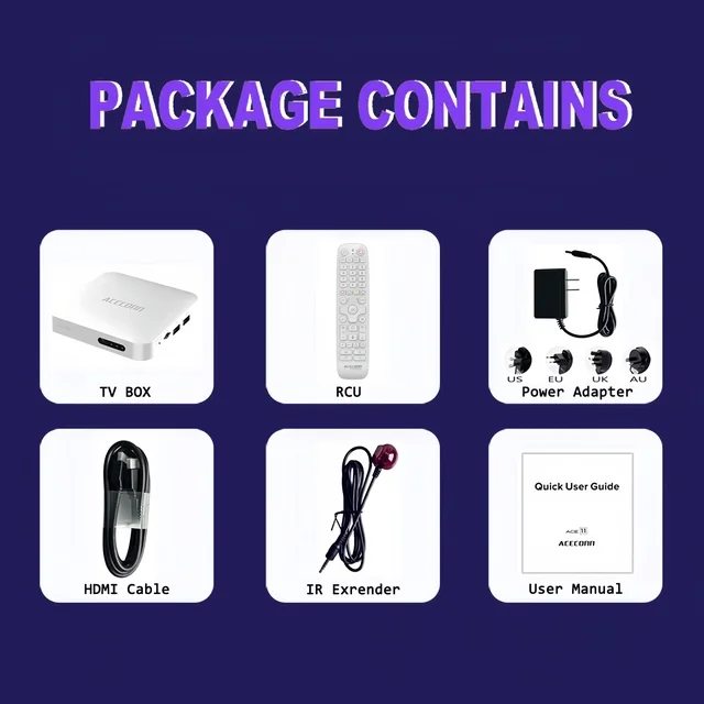 NOTE: This listing is for the product only. We do not provide any TV Channels, Subscriptions or any other Audio/Video Content. Item Specification Brand ACECONN Category Set Top Box OS Linux / Android 11 CPU Amlogic S905Y4 Quad-core RAM 2GB DDR3 Storage 32GB eMMC Expand TF Card up to 128GB Video Output HDMI 2.1 Max Resolution 4K @ 60Hz HDR HDR10 Video Codec H.265 / HEVC, VP9 Audio DTS Network Ethernet 100M / WiFi Bluetooth 5.0 USB 2 × USB 2.0 IPTV Yes DVB-T2 Yes Remote Included Power DC 5V 2A Power Consumption 24W Weight 580g Certification CE